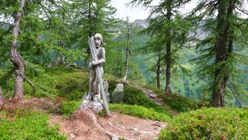Un skieur (ou une skieuse) sculpté(e) dans le bois.