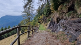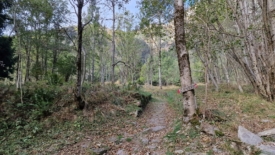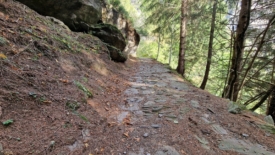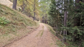 Nous passons devant un bâtiment, divisé en deux parties. L’une a été superbement rénovée et la seconde est en plein travaux. Nous croisons d’ailleurs, quelques minutes plus tard, un ouvrier poussant une brouette chargée de ciment. Heureusement pour lui, la piste est maintenant large et plane. Les pavés ont fait place aux aiguilles de mélèzes.