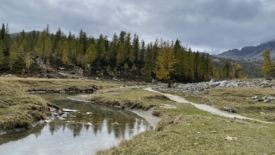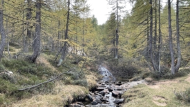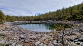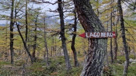 Le sentier nous dirige vers la zone boisée. Environ 300 mètres après avoir pénétré la forêt de mélèzes, nous arrivons au Lago Nero. De noir, il n’a pas grand-chose.