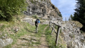 Le sentier se faufile maintenant dans une faille et Stefano est tout content de constater que des barrières de protection limite l’exposition au vide. Après deux ou trois virages très secs, nous arrivons sur un replat.
