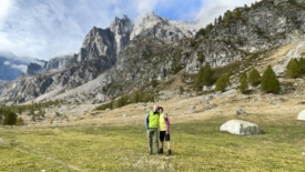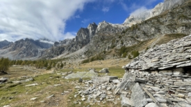 Nous trouvons une belle pierre plate, à proximité d’étables et de maisons et nous installons pour le pique-nique. Le relief de nos semelles saturé de déjections nous contraint à un minimum d’organisation et à délimiter une zone « propre ».