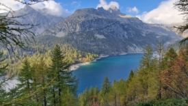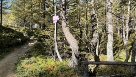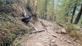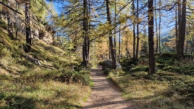 Nous retraçons une partie de l’itinéraire d’il y a quelques jours, comme prévu, mais cela n’est pas pour nous déplaire. Nous attrapons, par intermittence, une belle vue du lac, contemplons les troncs souvent sinueux et informes des mélèzes et apprécions les efforts fait par les anciens pour que, des centaines d’années plus tard, des randonneurs puissent les arpenter pour leur plaisir. Nous leurs en sommes tellement reconnaissants !