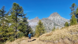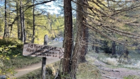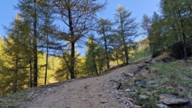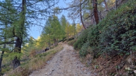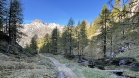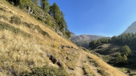 Nous commençons la randonnée du jour par suivre les traces de notre retour du Lago Pianboglio. Nous traversons le Torrente Devero et montons vers l’Alpe Sangiatto par le joli sentier qui serpente dans la forêt de mélèzes.