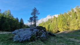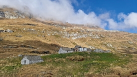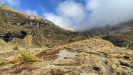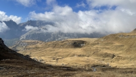Nous explorons les environs dans l’attente de la prochaine éclaircie avant de poursuivre notre chemin. Sur les flancs du Pizzo Pojala, près d’un gros rocher, nous voyons des quadrupèdes marcher. Ils sont bien trop loin pour que nous puissions reconnaître chamois ou bouquetin ou constater si un lapin est accroché à leur croupe.