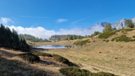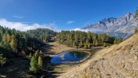 Le sentier s’enfonce dans la forêt de mélèzes et très vite nous pouvons contempler le Lago di Devero. Initialement j’avais demandé à Stefano de remonter un peu vers le nord pour pouvoir rentrer par le côté ouest du lac, à mon avis plus pittoresque, mais un regard sur la montre stoppe net mon enthousiasme. Si nous voulons rentrer avant la nuit, nous ne pouvons guère traîner. Une raison de plus pour revenir, en été de préférence, lorsque le soleil est dans sa phase lève-tôt et couche-tard.