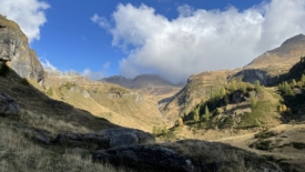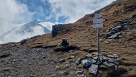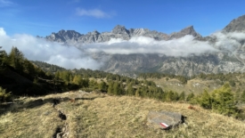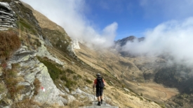 Nous remarquons que quelques nuages commencent à s’accrocher aux montagnes. Nuages ou bancs de brouillard ? Devant nous, une longue ligne droite, bien ensoleillée, qui va nous mener à l’Alpe Sangiatto.