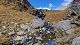 Au terme de notre sixième jour dans le Val d’Ossola, la randonnée du jour nous laisse exaltés et ravis. Partis de l’Alpe Devero par un froid glacial, nous franchissons la bochetta di Scarpia qui s’ouvre sur la vallée Agaro. Le sentier, accroché au flanc du Monte Corbernas, nous mène à l’Alpe Pojala. Contrairement au plan initial, nous poursuivons vers le Passo Pojala, avec, au passage, la découverte du joli Lago Poiala. Nous rentrons en longeant, de haut, le Lago di Devero.