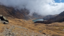 La traversée est extrêmement plaisante. Le terrain est facile mais varié et intéressant. D’abord caché par les nuages, le Lago di Agaro se révèle enfin, derrière nous.