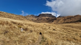 Nous sommes arrivés au bout du plateau et devant nous commence une belle descente. Nous nous retournons une dernière fois pour contempler le chemin parcouru et dire au-revoir au royaume de Poialino Ier. Nous reviendrons ici, c’est certain.