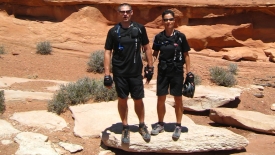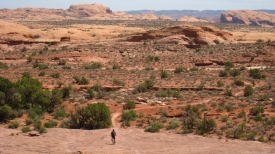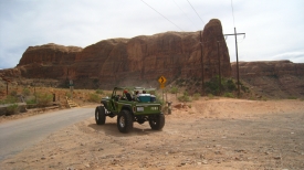 À proximité d’un parking où des jeeps sont garées, un groupe de gars signe un registre. Stefano lance, goguenard : “C’est ici qu’on s’inscrit pour les free drinks ?”. Les gars rigolent. Nous entamons une conversation. Deux bouteilles d’eau fraîche sortent d’un cooler, bientôt suivies de deux cannettes de bière… que nous refusons…. Ce sont des natifs de Salt Lake City. Ils pratiquent leur sport en famille. Un siège bébé est même installé à l’avant d’une des jeeps ! Un peu fada quand même !