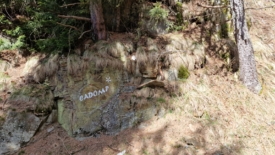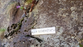 Nous passons un coude construit à moitié au-dessus du vide. Devant nous, une volée d’escalier digne d’une pyramide mexicaine. Un petit panneau métallique, vissé sur la roche, indique le nom de l’endroit : la schèra gránda. Le grand escalier. Pour être grand, il est grand. Grand et large. Un travail de construction précis, au milieu de la montagne, entre ciel et terre. A l’époque, ce sentier avait certainement une valeur commerciale importante, à l’image des travaux réalisés.