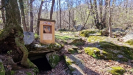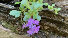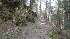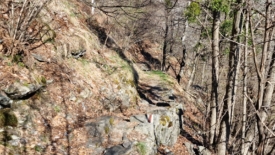Nous sommes heureux de retrouver des marches de pierre alors que de gros rochers décrochés de la montagne il y a fort longtemps viennent donner du relief au sous-bois.