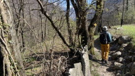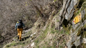 C’est après avoir franchi le riale di Mascengo qu’un passage exposé – heureusement bref mais appelant à la concentration extrême – nous rend silencieux. Nous ne pouvons nous coller à la falaise car des ronces y pendouillent. Elles cherchent désespérément un peu de compagnie et parviennent même à accrocher le pull de Stefano. J’oblige ce dernier à reculer pour dégager sans dommage les épines. Puis, à l’aide du bâton, je dégage le passage en repoussant les turions comme on le ferait d’un rideau. Stefano, tête baissée, avance. Un pas, puis deux, puis trois… C’est gagné.