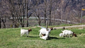 Deux petits chevreaux, qui ressemblent à s’y méprendre à des chiens, s’installent sous leur mère pour téter. Les coups qu’ils donnent pour faire venir le lait sont si brusques que leur mère les chasse d’un coup de patte.
