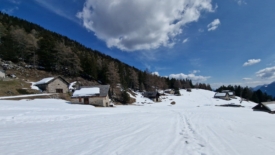 Il nous faut maintenant traverser une zone forestière, située dans la Valle del Bui del Brusóu. La route redevient sentier et disparaît sous la neige. Aucune trace ne vient nous conforter dans le choix des directions. Seules les traits rouge et blanc, peints sur le tronc des arbres, nous orientent. Certains doivent avoir été dessinés sur des rochers – aujourd’hui recouverts de neige – car nous hésitons souvent. Par endroit la couche de neige est profonde. Nous passons sans préavis d’une surface gelée à une zone tendre où le pied s’enfonce, puis le mollet et parfois le genou. En retirant le pied du trou, la neige, insidieuse, en profite pour se faufiler dans la chaussure. Nous nous arrêtons souvent pour la mettre dehors.