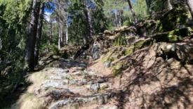 A part une courte section juste avant l’église San Pellegrino, le sentier n’offre pas grand intérêt. Sa surface est constituée de pierres qui roulent posées sur une surface un peu sablonneuse.