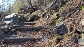 Le sentier sur lequel nous progressons a été construit et consolidé par des pierres, soit disposées en forme de marche lorsque la déclivité est importante, soit sous forme de pavés, de taille variable.