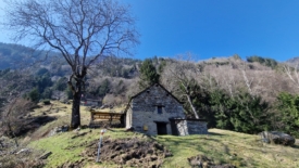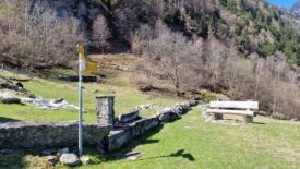 Nous restons en zone herbeuse jusqu’à Cavagnago. Pendant que je vide ma chaussure des quelques cailloux qui ont réussi à s’y introduire, Stefano engage la conversation avec un local. Il m’avouera plus tard, un peu penaud, que le monsieur a commencé à lui parler en dialecte du coin mais que, devant son incompréhension, il a finalement basculé sur le dialecte dit de la ferrovia, dialecte répandu dans toute la vallée.