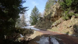 Le sentier rejoint une route goudronnée avec laquelle il se mêle. La neige commence à faire son apparition.