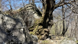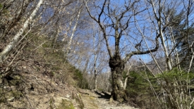 Le sentier rejoint la route. Nous admirons un châtaignier imposant, au tronc creux. La majeure partie des branches sont mortes mais une porte encore les feuilles de l’été passé, brunes et sèches, recroquevillées sur elle-même. Je dis à Stefano : peut-être que les châtaigniers, c’est un peu comme les bristlecones pines de Bryce canyon. Une partie de l’arbre peut mourir sans affecter la vitalité de l’arbre.