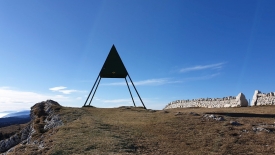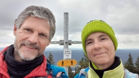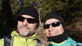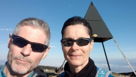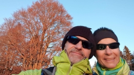 Lorsque nous sortons du pré boisé, nous sommes exposés à un vent fort et glacial. Arrivés au point géodésique, nous ne nous arrêtons que pour un autoportrait. A deux reprises, le vent manque de me faire perdre l’équilibre. Inutile de dire que nous renonçons momentanément à notre pause pique-nique.
