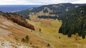 La montée aux Crêt des Danses, en suivant le mur, s’avère moins pire que je ne le craignais. Nous avons une magnifique vue sur le Creux du Croue.