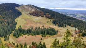 Nous partons à l’assaut du Crêt de Mondisé en faisant un crochet par La Réserve, qui est fermée. Stefano fait un sans faute pour redescendre sur la route qui mène au Pré de Ballens par un sous-bois moussu et très aéré.