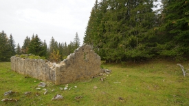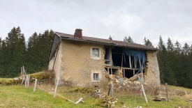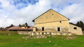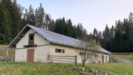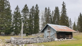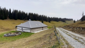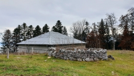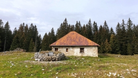 La montée continue, par le sentier du Coq puis par la route. Nous traversons Les Fornets, un pâturage sur lequel les fondations d’un chalet écroulé sont encore visibles. Nous arrivons à la Citerne couverte du Pré de Villars. Deux enfants jouent dehors, autour d’un feu. Des voix s’échappent de l’intérieur. Nous passons notre chemin et continuons vers La Perroude de Vaud.