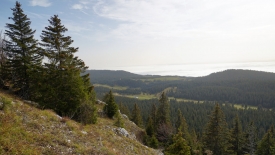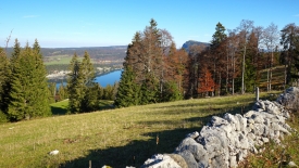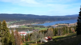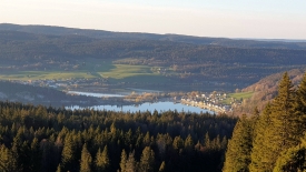 Nous suivons une longue ligne droite dans la forêt. Et lorsque les arbres se raréfient, nous avons une splendide vue sur Le Sentier et le lac de Joux.
