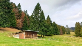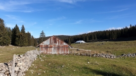 Avant d’arriver au couvert de la Foirausaz, nous avons dû déjà nous mettre en retrait 3 ou 4 fois pour laisser passer des voitures. C’est pire que sur le périphérique en heure de pointe. Nous entendons le vrombissement des motos dans les virages de la route du col du Marchairuz. Une véritable plaie.