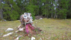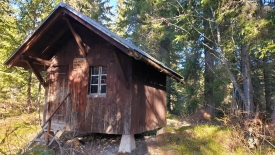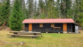 Le même chalet, côté sud. Autrefois, les tôles ondulées étaient peintes en rose. La première fois que nous étions venus ici, nous y avions pique-niqué et j’avais remarqué une pièce de protection métallique tombée du toit. Elle est toujours par-terre, près de 3 ans après. Dommage, car la charpente est maintenant à nu et exposée aux intempéries.
