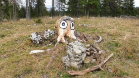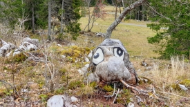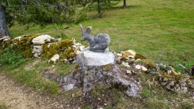 En entendant nos voix, Marco sort. Après quelques secondes il nous reconnaît et nous invite à rentrer. Difficile de refuser, même si la prudence, en ces temps de Covid, est de mise. Une saucisse grille sur le feu, surveillée de près par Christophe, un gars de Bois d’Amont. Ils sont au blanc. Nous préférons de la Badoit. Depuis une certaine balade à vélo à La Barillette où nous avions été convié à partager un verre de blanc avec les bergers, nous nous en méfions ! Christophe nous parle d’une pierre celtique qu’il a découvert après de longues recherches près du Crêt des Danses. Il nous donne des indications pour la trouver. Marco nous parle d’une grotte, dans la falaise faisant face à la bergerie, grotte qui fut occupée par des moines durant la révolution.