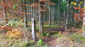 Le sentier qui traverse La Chaudière d’Enfer (j’ai toujours adoré ce nom) n’est pas aussi bucolique que lors de notre tout premier passage. Le secteur a été « agressé » par des coupes d’arbres, et plus précisément par les engins de débardage. Un vrai massacre. De vastes ornières recouvertes d’eau ponctuent le sentier. Les feuilles, qui normalement recouvrent la boue provoquée par les récentes pluies ont été dérangées et n’offrent plus le tapis de protection habituel. Résultat, nous pataugeons dans la gadoue.