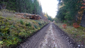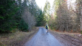 Nous sommes touts contents de retrouver la route goudronnée qui monte depuis l’Abbaye. Encore que, toute goudronnée qu’elle soit, elle est recouverte sur quelques dizaines de mètres par de la boue, tombée des pneus des engins forestiers.