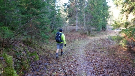 La montée se fait d’abord dans le pré (je déteste les montées raides dans les pâturages mais ma détestation n’y changera rien) puis dans la forêt au sous-bois particulièrement sobre.