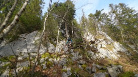 De là, nous partons vers le nord pour rejoindre un mur que nous suivons jusqu’à arriver en vue de la crête. Facile. Fun même si c’est raide : le terrain est varié et il nous faut louvoyer entre les rochers et les lapiaz.