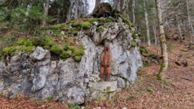 Parce que les bourrasques sont si violentes que parfois elles nous déséquilibrent, nous évitons le sentier exposé. Ce qui nous donne l’occasion de passer près de la croix.