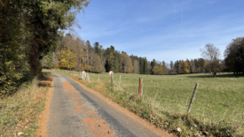 Nous resterons sur la route jusqu’au retour à la voiture. D’abord parce que le ciel est assombri et que nous n’y voyons goutte. Ensuite car la route, large et surtout libre de toute voiture – merci la barrière – nous permet de marcher de front, en papotant de choses et d’autres.