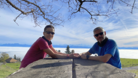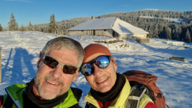 Le petit vent frisquet nous fait nous réfugier au chalet du ski-club de Nyon pour le casse-croûte. Nous avons la chance d’arriver les premiers et nous installons sur les marches, qui seront plus d’une fois convoitées par d’autres…