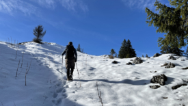 Malgré la couche de neige fine, sans sous-couche, nous voyons des traces de raquettes et des traces de ski. Il y a eu des impatients !