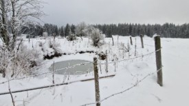 Parce que le froid est perçant malgré le soleil, une petite montée s’impose. Destination ? Les Petites Chaumilles où les abords ont été piétinés par des dizaines de sabots de mammifères divers. Nous repérons des traces de sangliers, mais également des sabots de grandes tailles, cerfs ou biches. Peut-être qu’une rave party sauvage était organisée ?