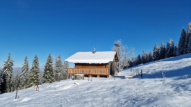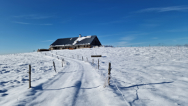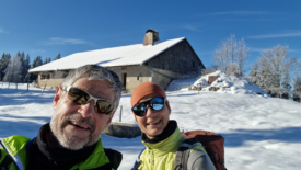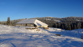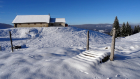 Le chalet de la Dôle. Entre le sommet et le chalet, nous avons trouvé un petit coin abrité et ensoleillé pour notre pique-nique. Nous en sommes néanmoins repartis avec doudoune, gants et bonnets.