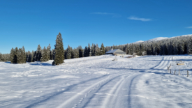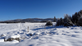 Nous suivons le pâturage dans toute sa longueur avant de trouver une trace de moto neige qui suit approximativement le sentier. Dans la forêt, la couche de neige est encore plus fine et à plusieurs reprises les crampons métalliques de nos raquettes ripent sur un caillou. Nous sommes contents de retrouver le soleil.