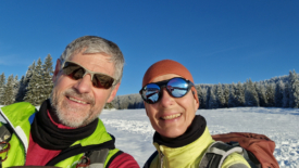Parce qu’hier nous avons constaté que la couche de neige est relativement mince, pas plus que 20 cm, nous avons opté, ce matin, pour nos raquettes Symbioz Elite, plus légères et maniables que leurs grandes sœurs, les 418-438 up & down grip. J’ai donc mis des chaussures légères, les Salomons 4D, pour bénéficier pleinement du déroulé du pied. Grâce au froid, j’ai peu de chance de rentrer avec les pieds mouillés, même si l’étanchéité de ces chaussures n’est pas leur point fort.