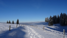 Nous marchons sur nos traces d’hier, que personne d’autre n’a foulé. Le soleil se rapproche de l’horizon. La lumière devient encore plus belle. Le passage dans la forêt, avant d’arriver aux Grandes Chaumilles, nous prive des quelques rayons qui restent. Au gré de creux et des bosses, nous sentons la température monter et descendre, au point, certaines fois, de sentir le froid piquer le visage et enserrer le front.