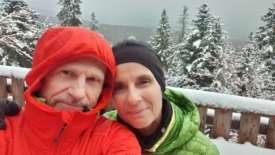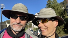 A Flaine. Stefano fait la moue car je lui ai dit : tant pis, avec les chapeaux. Stefano déteste les chapeaux !