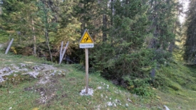 Sur le portail qui permet d’accéder à la piste de VTT, une banderole pendouille, aux 3/4 détachée. Elle annonce des travaux forestiers et interdit le passage à quiconque. Mais vu son état, nous passons outre l’interdiction, pensant qu’elle a été oubliée là.