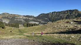 Bien qu’hier j’ai fait part de ma détestation de la marche dans une pente herbeuse, notre guide local, qui n’est autre que mon petit frère, ignore superbement ma déclaration. Et c’est au terme d’une belle montée dans les champs, face à la montagne, sans détour, que nous arrivons au Grand Grenier.