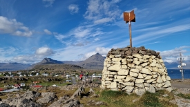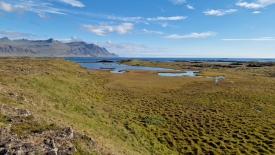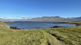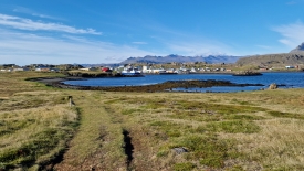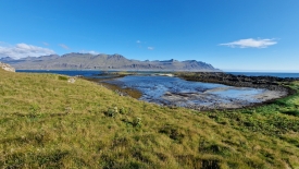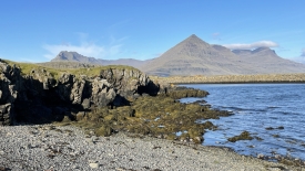 A l’hôtel, nous avons trouvé un petit dépliant qui indique quelques balades à faire autour du village. Celle choisie par Luana va suivre le bord de la péninsule au nord-est de la bourgade. D’abord, nous ferons face aux montagnes de l’autre côté du fjord Berufjörður, puis nous aurons en ligne de mire la pleine mer, avec l’île de Papey en ligne de mire.