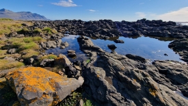 Nous avions presque oublié la délicieuse sensation du soleil sur la peau. La brise marine maintient l’air frais et vivifiant. Même si nos yeux sont encore pleins du merveilleux paysage de glace et d’eau du Jökulsárlón, l’absence de soleil nous a maintenu dans une atmosphère peu colorée, presque monochrome. Aujourd’hui, par contre, c’est une explosion de couleur.